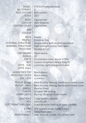 STK certificate of Authenticity, custom STK guitar strap, user manual, tool kit, Luminlay light charger, microfiber cloth.