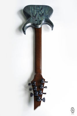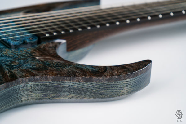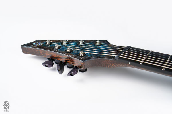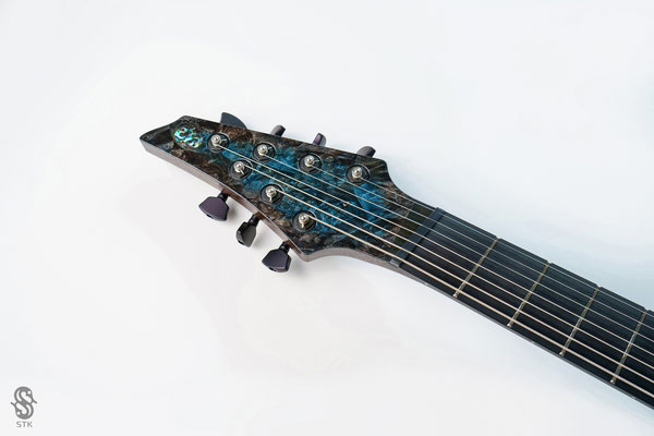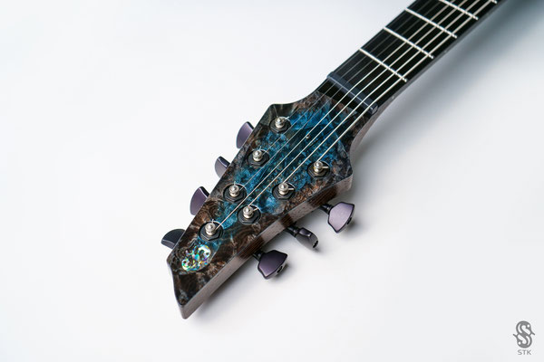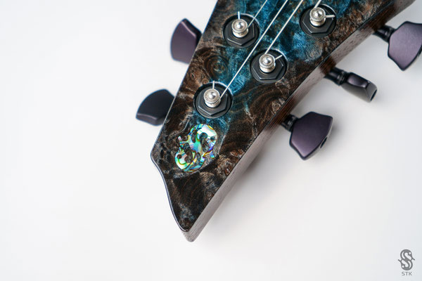 Maple burl headstock top and truss rod cover, crafted from the same piece of the guitar top.