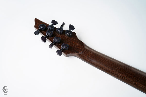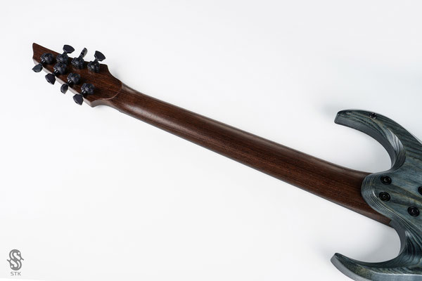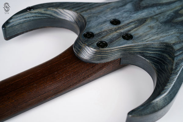 Wenge neck sculpted entirely from a single piece, featuring angled headstock and volute, plus carbon fiber internal structure and precise double action truss rod.